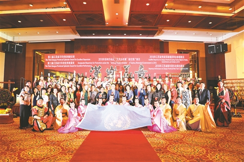 7月19日下午,聯(lián)合國官員中文培訓(xùn)團一行42人來到徐州,下榻美麗的云龍湖畔,并參加了徐州市政府舉辦的歡迎會,雙方互贈了聯(lián)合國旗幟和徐州漢畫像石拓片等禮物,徐州演藝集團漢樂團表演了大型民族音樂《漢樂華章》。