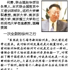 由聯(lián)合國工作人員參加的中文培訓(xùn)項目每年暑期在南京大學(xué)開展3周的培訓(xùn),這項活動已開展了16年,去過中國許多地方,今年是第一次到徐州進行短期文化交流。本次聯(lián)合國官員中文培訓(xùn)團領(lǐng)隊何勇曾于1975年至1986年期間在徐州求學(xué)和任教,后赴紐約哥倫比亞大學(xué)攻讀學(xué)位。視徐州為第二故鄉(xiāng)的何勇博士向培訓(xùn)團成員大力推介了徐州,促成了徐州之行。
