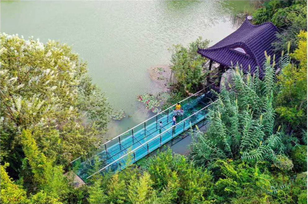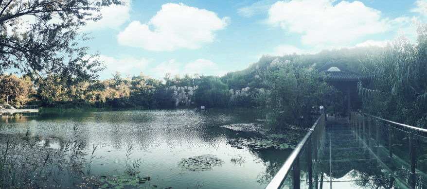 玻璃橋位于金龍湖珠山宕口公園內(nèi)橋面采用鋼化玻璃設(shè)計藍(lán)天白云倒映在玻璃橋上隨手一拍就是絕妙的網(wǎng)紅照。