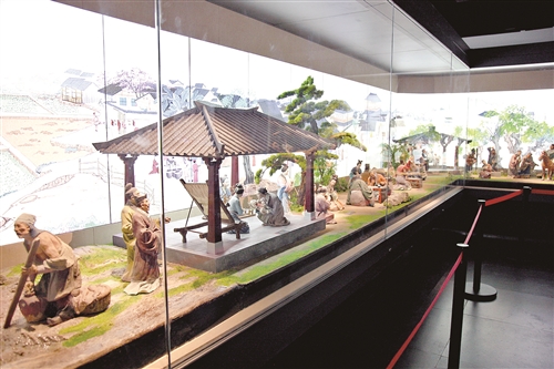 漢畫像石復(fù)制品包括庖廚圖、車馬出行圖、炎帝升仙圖、黃帝升仙圖。庖廚圖出土于銅山漢王東沿村,正面第一層刻一人在案上切肉、一人在爐上烤肉串,旁邊懸掛待烤的肉類;第二層刻擺放的酒器和汲水、燒灶的場景;第三層刻迎賓的場面。側(cè)面上刻一朱雀,下刻雙闕,闕內(nèi)有一執(zhí)戟門吏。此塊漢畫呈現(xiàn)了兩千年前漢代人的燒烤過程,原石展陳于漢畫像石館的南館。
