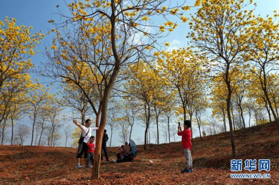 2月21日,游人在南寧市青秀山風(fēng)景區(qū)觀賞盛開的黃花風(fēng)鈴木。