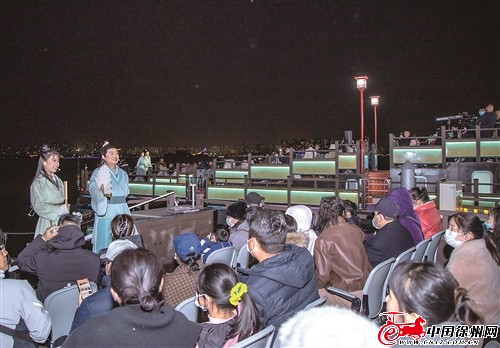 借蘇軾詩詞命名的“快哉號”“邀月號”兩艘128座觀演游船緩緩駛動,兩船之側(cè)的一葉扁舟上,“蘇軾”意氣風(fēng)發(fā)地行進在赴任途中。