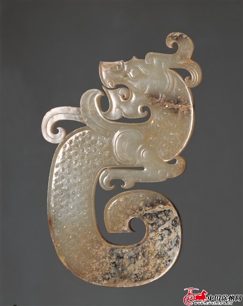 同墓出土的玉龍,瑩潤(rùn)有玻璃光澤,單體龍身體卷曲,張須露齒,雙目圓睜,鬣毛向兩邊卷曲,前肢曲折,龍尾上卷,將龍潛深淵、蟄伏待時(shí)的意蘊(yùn)刻畫(huà)得淋漓盡致。
