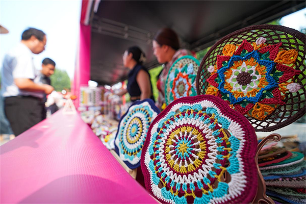 6月28日,在山東省鄒平市的夏季“黃河大集”山東手造非遺市集,顧客在購買產(chǎn)品。