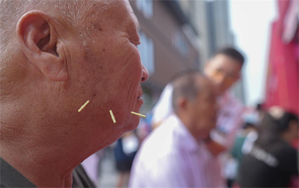 6月28日,在山東省鄒平市的夏季“黃河大集”中醫(yī)養(yǎng)生市集,醫(yī)生為顧客針灸。