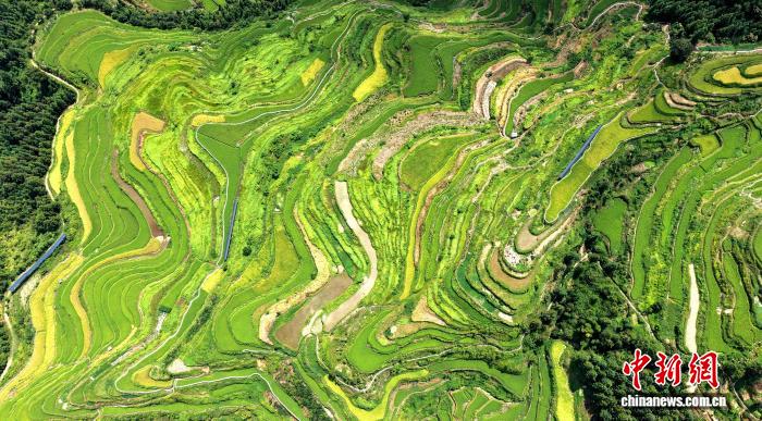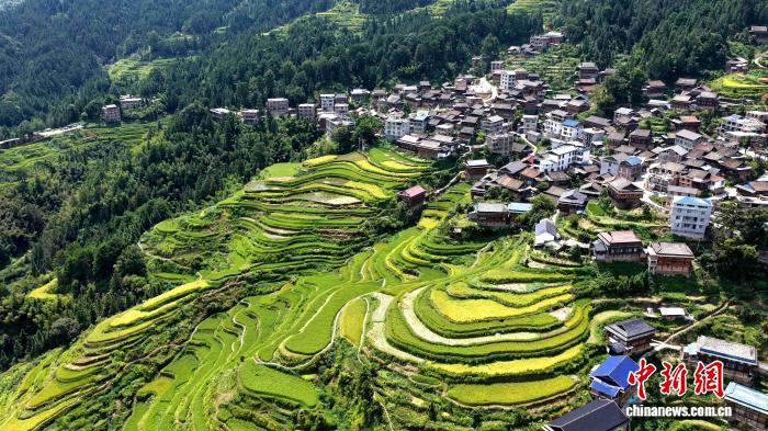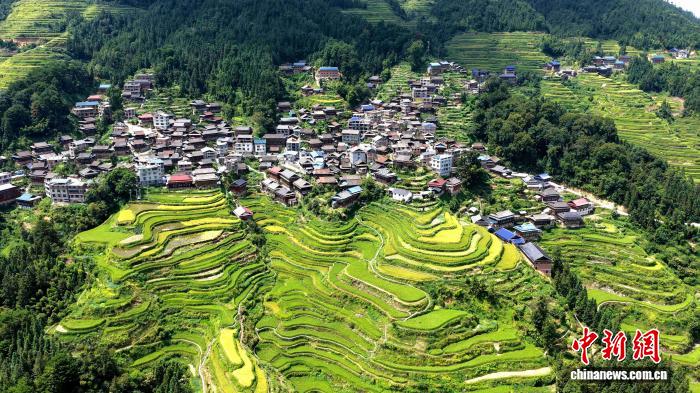 9月18日,無人機航拍廣西三江侗族自治縣富祿苗族鄉(xiāng)大順村,層疊起伏的梯田如天然雕琢的藝術階梯,民居錯落有致,與青山翠林相映成趣,構成一幅幅詩意盎然的生態(tài)畫卷。圖為當?shù)靥萏镲L光。龔普康 攝