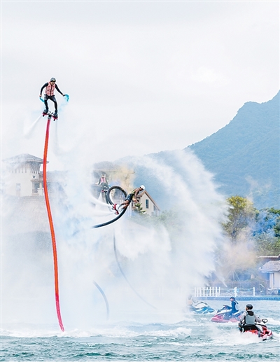 廣東省廣州市增城區(qū),依托廢棄礦湖、溫泉等資源打造的森林海旅游度假區(qū)內正在進行水上表演。