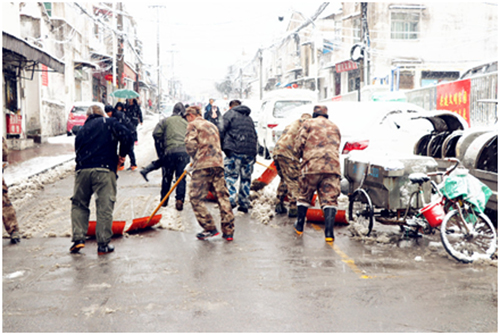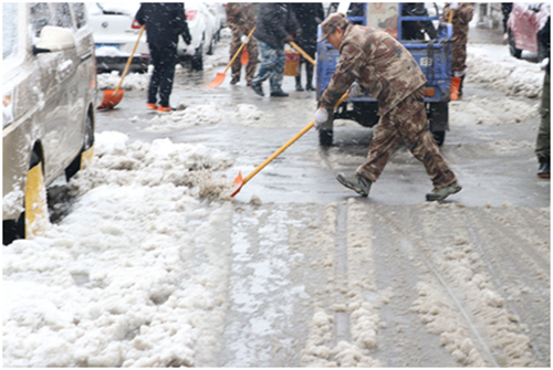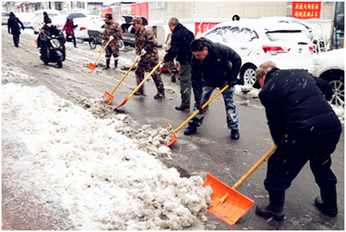1月30日晚,徐州突降大雪。31日一大早,徐州下淀社區(qū)全體干部、黨員志愿者60多人,帶著除雪工具,齊聚下淀南路清除積雪。將這條長(zhǎng)達(dá)幾百米的下坡道清除干凈,讓行人不再為摔倒摔傷擔(dān)驚受怕。