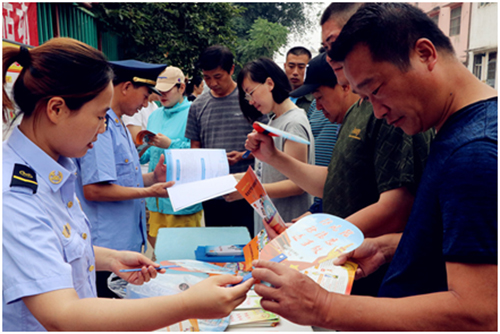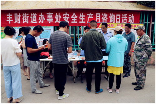 消防演練前,向過往群眾發(fā)放宣傳資料和印有“防風險、除隱患、遏事故”紙扇,并回答路人咨詢。豐財辦事處副主任劉馨陽、豐財辦事處安監(jiān)辦主任劉武、鼓樓區(qū)市場監(jiān)督管理局豐財分局領導到現場指導。