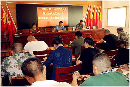 7月19日下午,下淀社區(qū)第六屆居民委員會(huì)第二十六次成員代表大會(huì)暨2019年第二季度勤廉雙述大會(huì)在四樓會(huì)議室舉行。大會(huì)就下淀社區(qū)廣山路中段“街區(qū)治理”等重大事項(xiàng)進(jìn)行了通報(bào),參加大會(huì)的56名村民代表進(jìn)行了表決。隨后,財(cái)務(wù)朱友琴作了上半年財(cái)務(wù)收支報(bào)告、黨委書記付化友、社區(qū)主任李普華分別作勤廉雙述工作述職述廉報(bào)告。