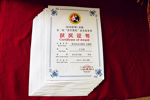 徐州下淀社區(qū)武術(shù)隊(duì)派出的8名隊(duì)員,個(gè)個(gè)表現(xiàn)不俗,在與眾多武林高手的激烈角逐中,最終奪得“集體二等獎(jiǎng)”、“道德風(fēng)尚獎(jiǎng)”、“優(yōu)秀教練”和“優(yōu)秀運(yùn)動(dòng)員”獎(jiǎng)杯;孟晶、倪守英分獲太極扇老年女子A組、B組一等獎(jiǎng);孟晶獲24式太極拳成年女子組一等獎(jiǎng);王玉慶獲陳氏56式太極扇老年男子組一等獎(jiǎng);孟晶、王玉慶在傳統(tǒng)對(duì)練中獲二等獎(jiǎng)。另外,8名運(yùn)動(dòng)員還分別獲得個(gè)人18個(gè)單項(xiàng)獎(jiǎng)。