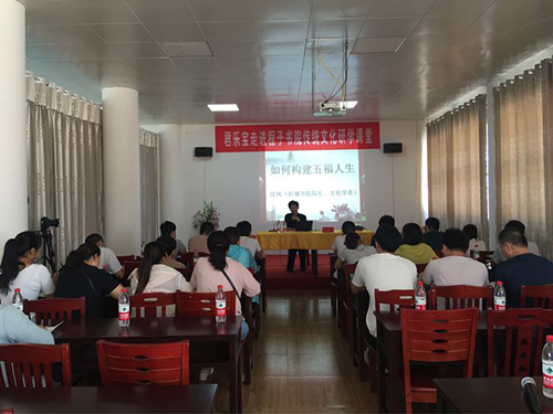 彭城書院院長、著名文化學(xué)者漢風(fēng)先生應(yīng)邀到梁寨淵子湖、程子書院為江蘇君樂寶公司員工開展傳統(tǒng)文化研學(xué)活動。他以如何構(gòu)建五福人生為題,用風(fēng)趣幽默的語言講自己家的福報故事,用傳統(tǒng)文化的根基論自己與孩子的幸福人生,讓每位聽眾受益匪淺。