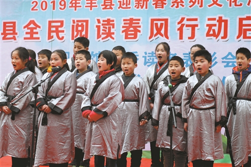 1月12日,豐縣小讀者獲贈書籍并集體誦讀《論語》《孝經(jīng)》。當(dāng)日,豐縣文廣體局和豐縣全民閱讀領(lǐng)導(dǎo)小組辦公室,啟動(dòng)全民閱讀春風(fēng)行動(dòng)暨優(yōu)秀讀者表彰會,發(fā)出全民閱讀活動(dòng)倡議書,倡導(dǎo)廣大干部、職工、農(nóng)民和青少年愛讀書、讀好書、善讀書。