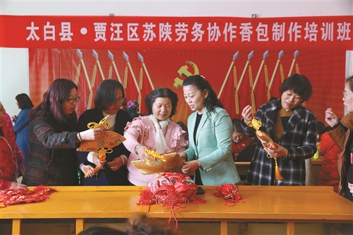2017年以來,賈汪區(qū)在太白縣開展技能培訓(xùn)5期,培訓(xùn)失業(yè)人員253名,貧困人口52人。尤其是香包制作技能培訓(xùn),幫助一大批失業(yè)人員掌握了新的就業(yè)技能。同時,在賈汪區(qū)的幫助下,成立了太白縣首家“香包社區(qū)工廠”,帶動就業(yè)28人(其中貧困勞動力20人),端午節(jié)前第一批香包成品走上銷售渠道,每人每月增加經(jīng)濟(jì)收入1000元左右。