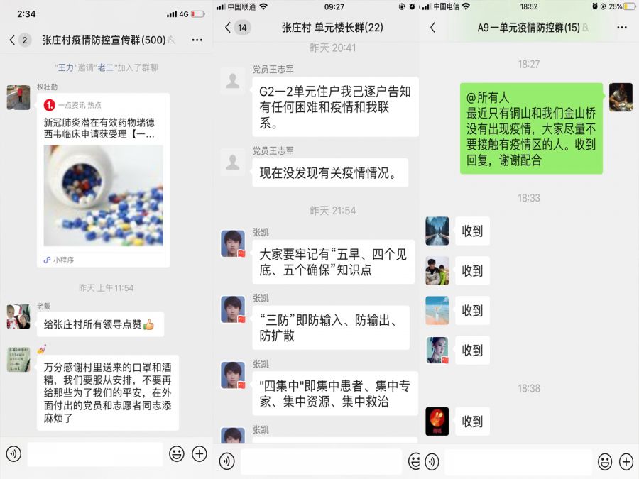 張莊村還建立起了三級微信群網(wǎng)絡(luò),即十戶聯(lián)防戶主群、十戶聯(lián)防負(fù)責(zé)人群、500人疫情防控宣傳群。十戶聯(lián)防戶主群里單元長為群主,每戶代表為責(zé)任人,每日報(bào)告疫情,做好宣傳覆蓋,不需見面就能讓問題在第一時(shí)間發(fā)現(xiàn)、第一時(shí)間處置,織密“疫情防控網(wǎng)”,形成了“發(fā)現(xiàn)及時(shí)、傳遞迅速、上下通達(dá)、落實(shí)有力”的“云上”疫情網(wǎng)格監(jiān)控機(jī)制。同時(shí),針對小區(qū)G1、G2樓居住多是老年人的情況,安排單元長每天入戶進(jìn)行宣傳、了解人員動(dòng)態(tài)等工作。