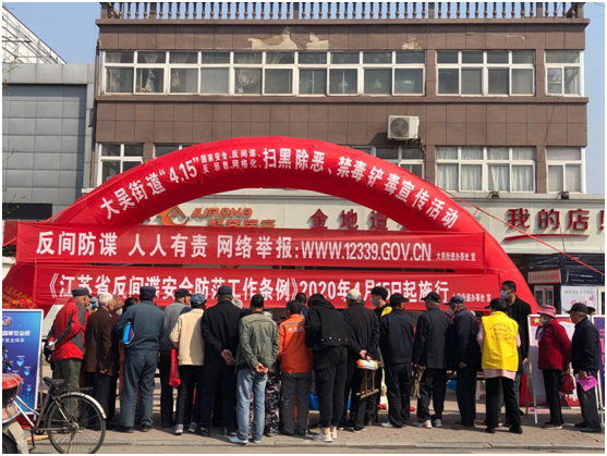 4.15日是全民國家安全教育日,為進一步增強廣大群眾的國家安全意識,推動國家安全宣傳教育工作深入開展,4月15日上午徐州市賈汪區(qū)大吳街道組織司法所、綜治、信訪、工會、安監(jiān)、婦聯(lián)在大吳街道步行街開展以“掃黑除惡、禁毒鏟毒、反間諜、反邪教”為主題的專項活動。