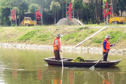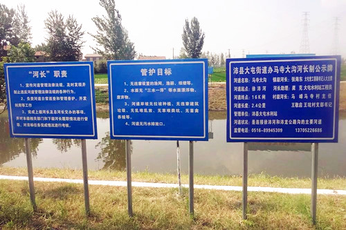 走進具有江蘇省“水美鄉(xiāng)村”之稱的馬寺大溝,河岸一邊立有藍色“河長制”公示牌,上面責任人和監(jiān)督電話一目了然,岸邊的巡河員和船上的保潔員正在例行檢查。
