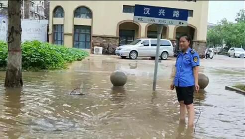下圖城管最美女隊(duì)員擼起褲管拉開(kāi)下水道排除漢興路積水并值守。
