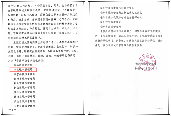 近日,在徐州市總工會(huì)大禮堂舉辦的徐州市城管系統(tǒng)“打造一流營商環(huán)境、唱響百姓城管之歌”主題匯演活動(dòng)中沛縣城市管理局被予以通報(bào)表揚(yáng)。