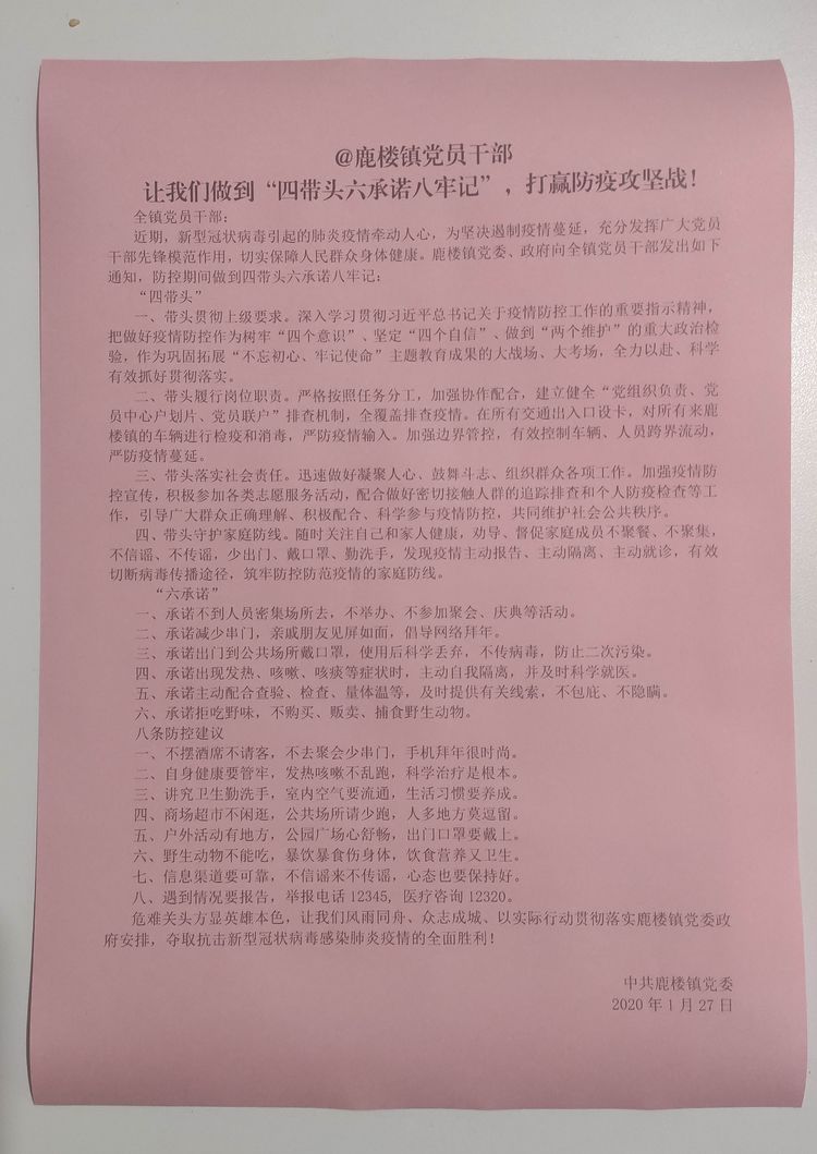 鹿樓鎮(zhèn)還向全體黨員發(fā)出了“讓我們做到“四帶頭六承諾八牢記,打贏防疫攻堅(jiān)戰(zhàn)”的倡議,鼓勵(lì)引導(dǎo)全鎮(zhèn)1700余名黨員堅(jiān)持沖鋒在前,爭(zhēng)當(dāng)群眾的貼心人。在這幾天天時(shí)間里,鹿樓鎮(zhèn)黨員干部勇挑重?fù)?dān),敢打硬仗,以高度的責(zé)任感保障了防疫工作措施的落實(shí),以對(duì)人民生命健康高度負(fù)責(zé)的精神,不停地奮戰(zhàn)在防疫戰(zhàn)線上。