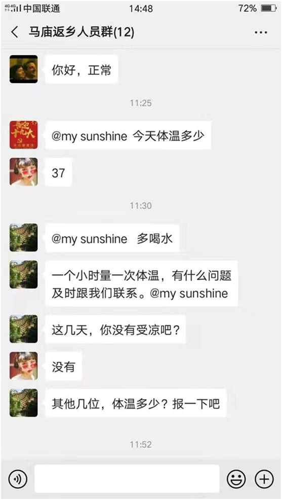 經(jīng)社區(qū)反復(fù)摸查,轄區(qū)確有若干群眾途徑武漢返鄉(xiāng),根據(jù)要求,潛伏期內(nèi)他們必須居家隔離觀察。每日上門隨訪工作存在一定的風險,但及時了解居家觀察人員活動情況和身體健康對防控工作至關(guān)重要。漢興志愿者利用先進便捷的現(xiàn)代通訊技術(shù)小程序,在第一次隨訪后建立微信群,以包掛負責制,每日視頻聯(lián)系隔離人員了解他們的活動軌跡與身體情況,要求他們早晚將量取的體溫信息發(fā)送至群內(nèi),科學(xué)便捷的管理方式為街道及時管理、安全管理、精準管理穩(wěn)控人員立下大功勞。