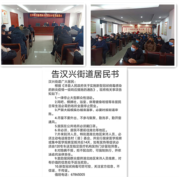 面對來勢洶洶的肺炎疫情,漢興街道辦事處高度重視,街道黨工委書記韓方興連續(xù)召開專題會議部署防控工作。1月25日,召開漢興街道新型肺炎疫情防控緊急部署會;1月26日先后召開漢興街道新型肺炎疫情防控工作調(diào)度會和疫情防控工作推進會。街道成立“一辦五組”,制定《告漢興街道居民書》、漢興街道“五包一”責(zé)任清單和漢興街道疫情防控應(yīng)急處置預(yù)案,與各村居簽訂疫情防控責(zé)任書,同時提前謀劃做好應(yīng)急物資購置和儲備。