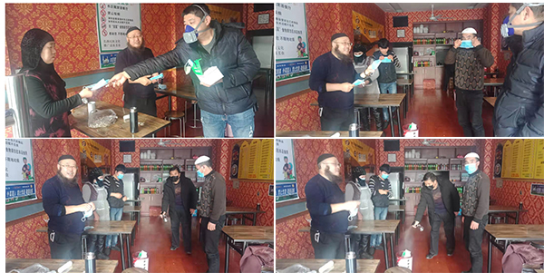 大屯街道防控工作人員給馬二力果一家送去口罩,并幫助他們消毒