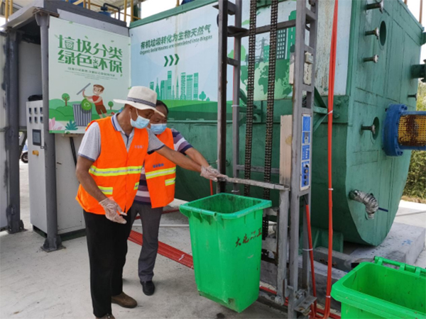 在董莊處置中心運行的設(shè)備采取干式厭氧發(fā)酵技術(shù),日處理易腐垃圾1噸,20天為一個生產(chǎn)循環(huán)周期,產(chǎn)生200公斤沼渣、6立方沼液、3000立方沼氣,產(chǎn)生的沼渣用于種植農(nóng)產(chǎn)品,沼液送至電廠集中處理,產(chǎn)生的沼氣罐裝后獎勵給分類好、積分高的村民。