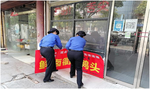執(zhí)法人員清除店鋪違規(guī)廣告