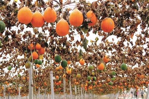 走進(jìn)徐州泰碩藥材種植有限公司的種植園,只見(jiàn)一排排架子上爬滿了綠油油的藤蔓,一個(gè)個(gè)果實(shí)好似球形掛滿了枝頭。“這就是瓜蔞,俺的寶貝。”“你們來(lái)的不是時(shí)候。”何橋鎮(zhèn)瓜蔞產(chǎn)業(yè)園負(fù)責(zé)人朱靜認(rèn)為的“時(shí)候”,指的是初冬收獲季節(jié),那時(shí),映入眼簾的是一眼望不到邊的橘黃色瓜蔞,像一個(gè)個(gè)“金疙瘩”掛在藤架上。