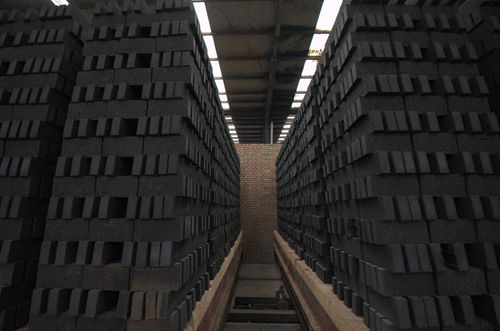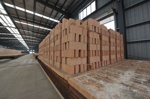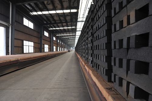 --車間內(nèi),一方方碼放整齊的新型秸桿空心磚坯正等待進(jìn)入像大集裝箱一樣的燒結(jié)線,生產(chǎn)方式一改傳統(tǒng)小磚窯的落后面貌,令人耳目一新。